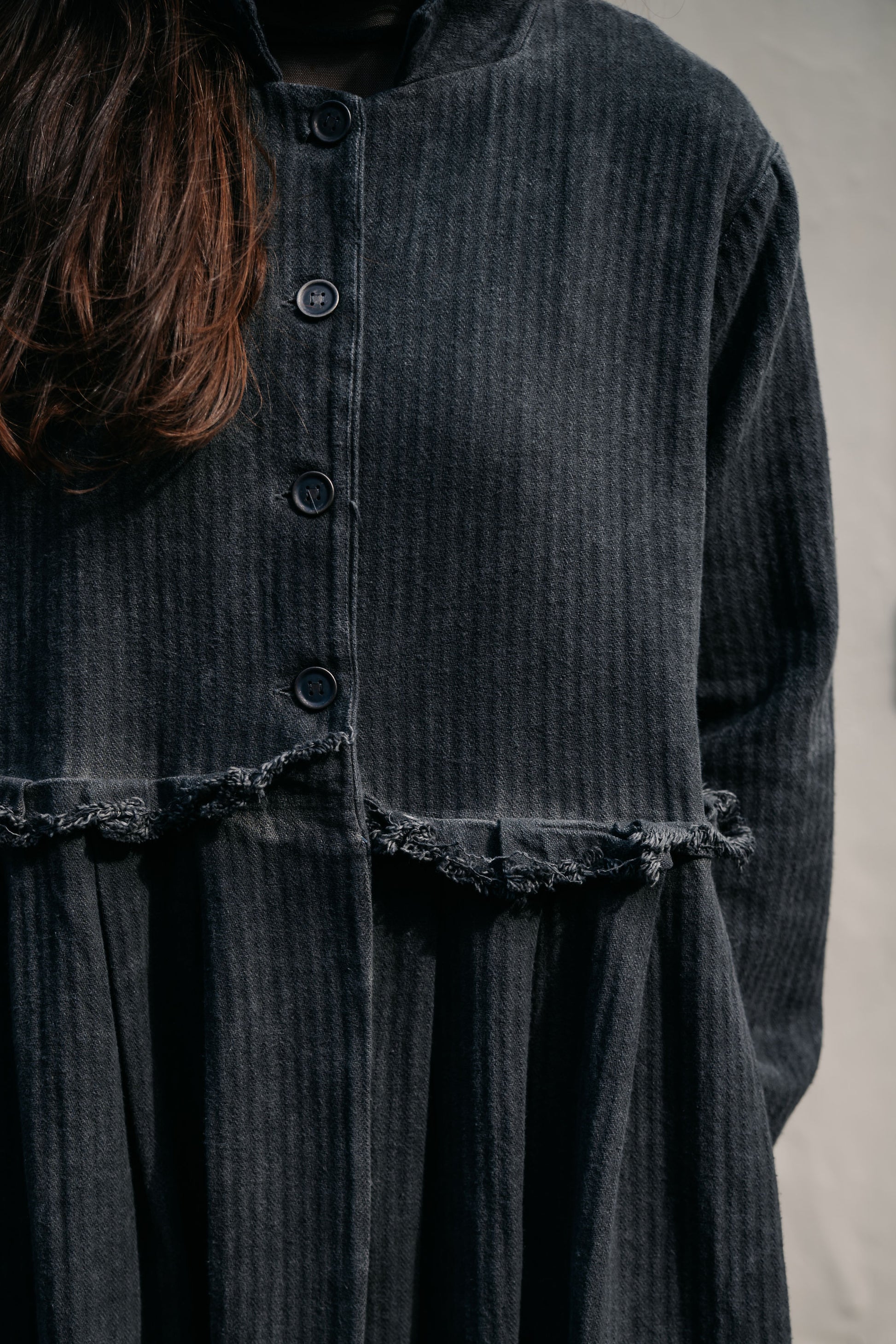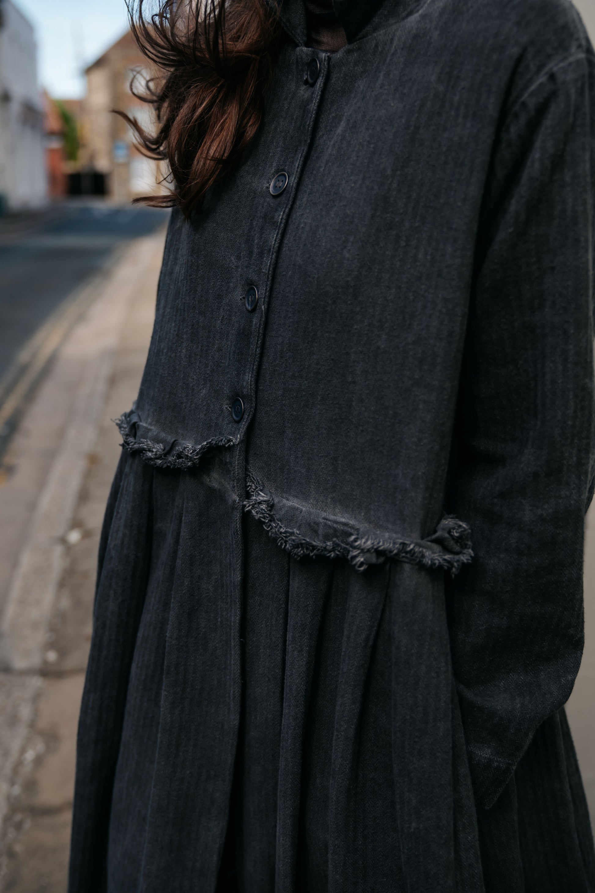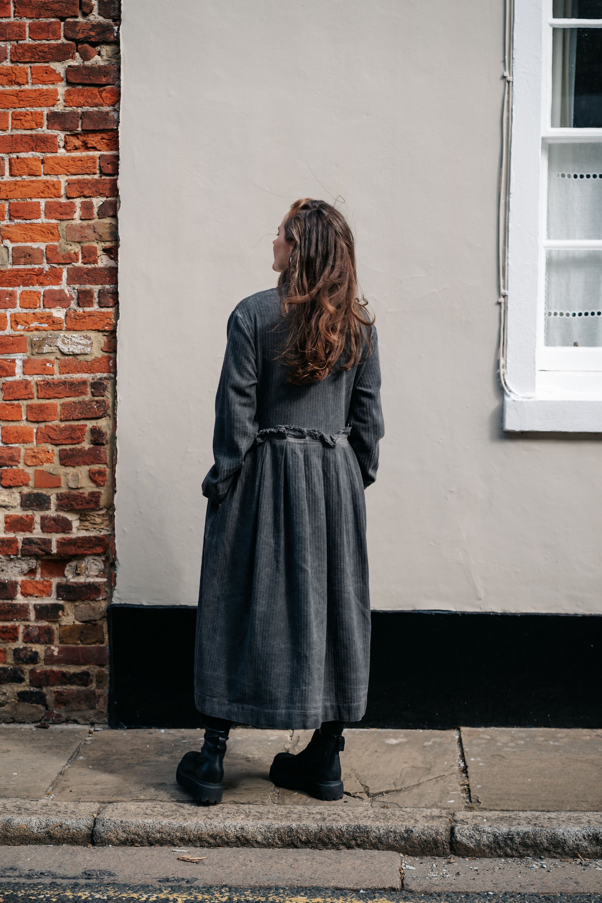 Dark grey long sleeved midi dress coat, featuring stunning ruffled detail around the natural waist and flowy midi - length skirt. The fabric has soft, ribbed texture