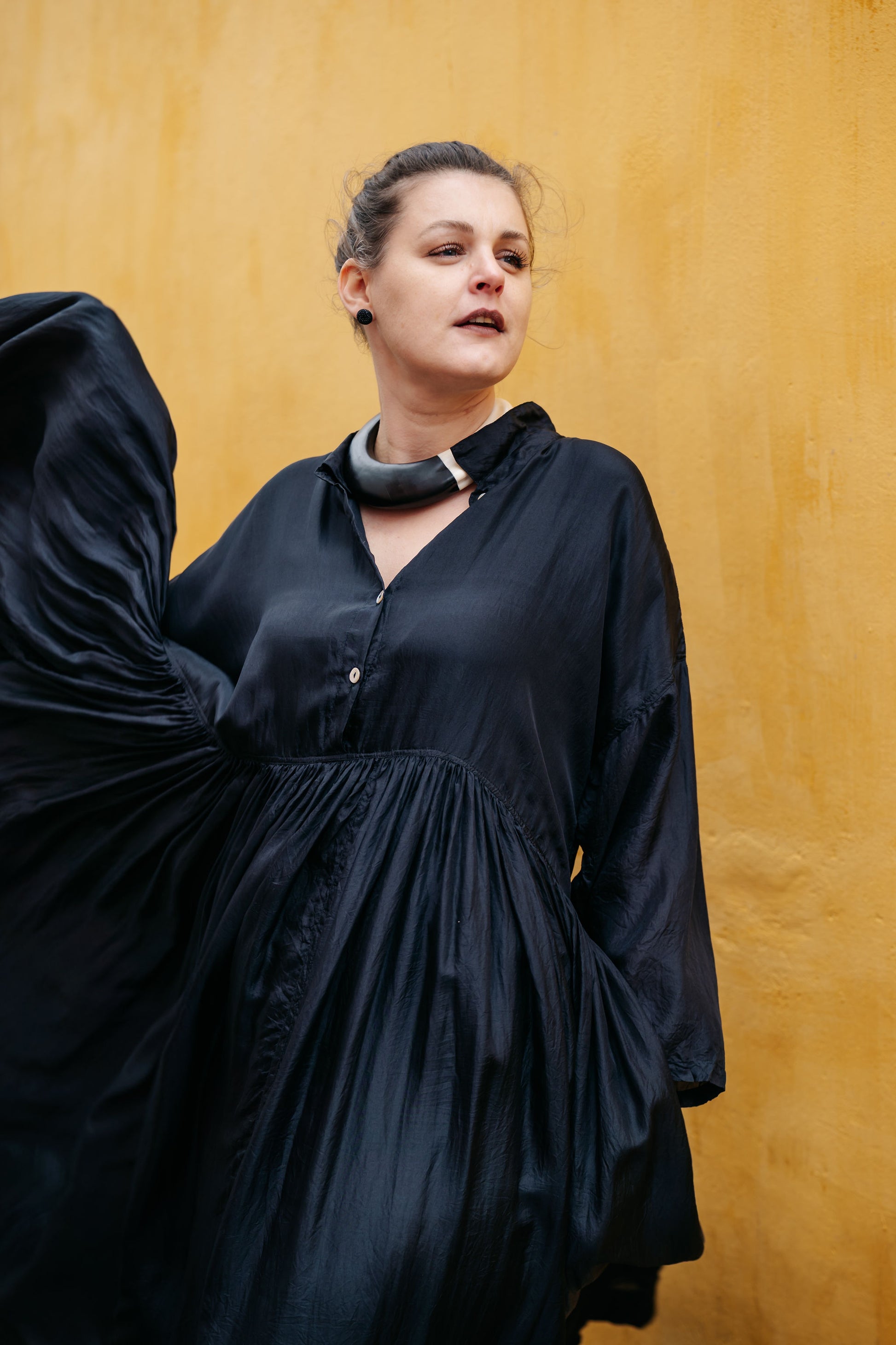 This much-loved shape is reimagined in luxurious silk, giving it a beautifully fluid and weightless feel. The result is both refined and quietly dramatic. Designed with a classic shirt collar and button-down front, the gathered waist falls into a full, flowing skirt for an elegant balance of structure and softness.