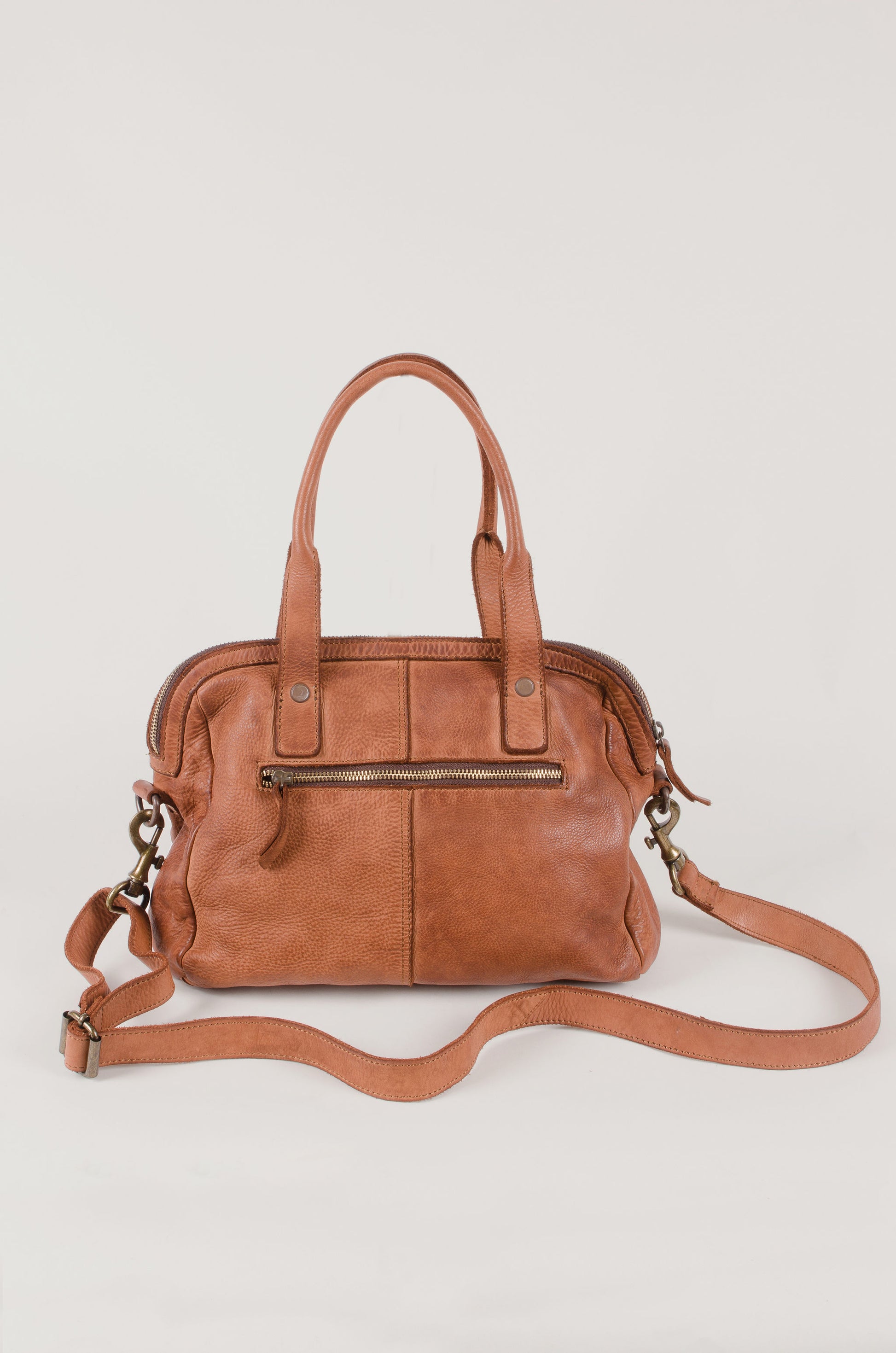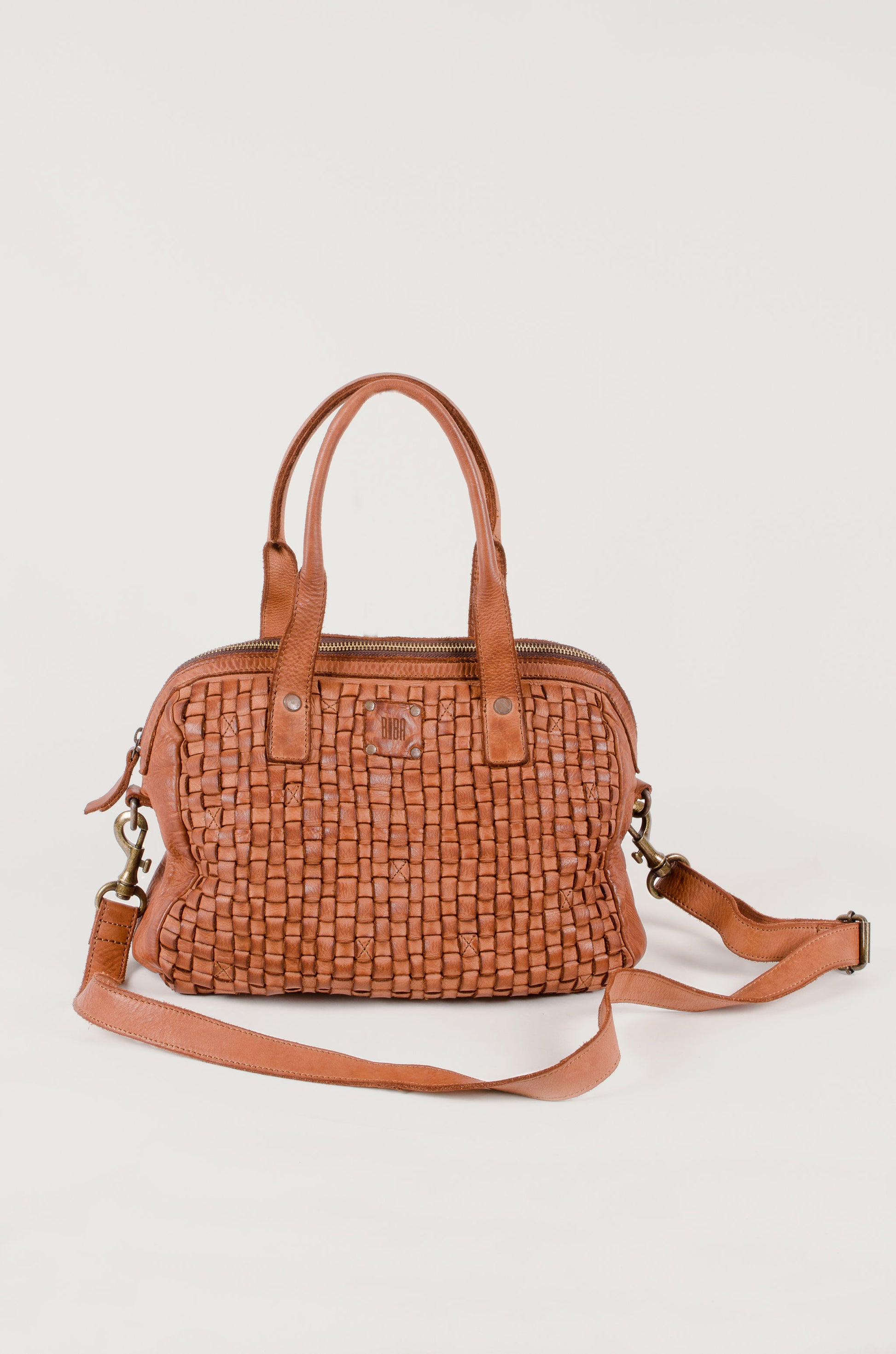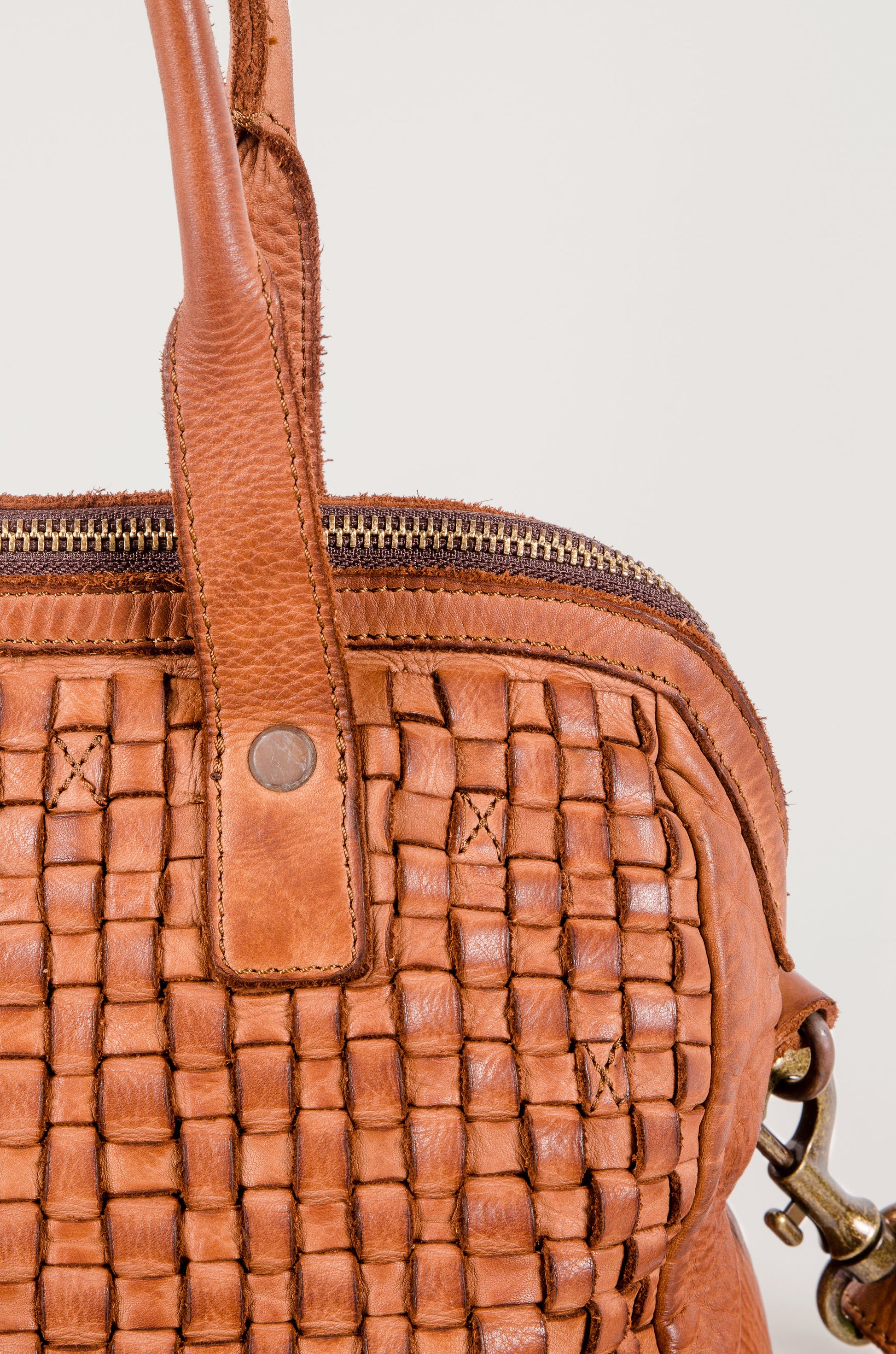 Washed and woven cowhide leather bag with a vintage finish. This bowling bag lies somewhere between classic handbag and crossbody bag, and it holds its own as both. It is an understated shape that will fit right in with any style. Will develop a patina over time and deepen in colour.