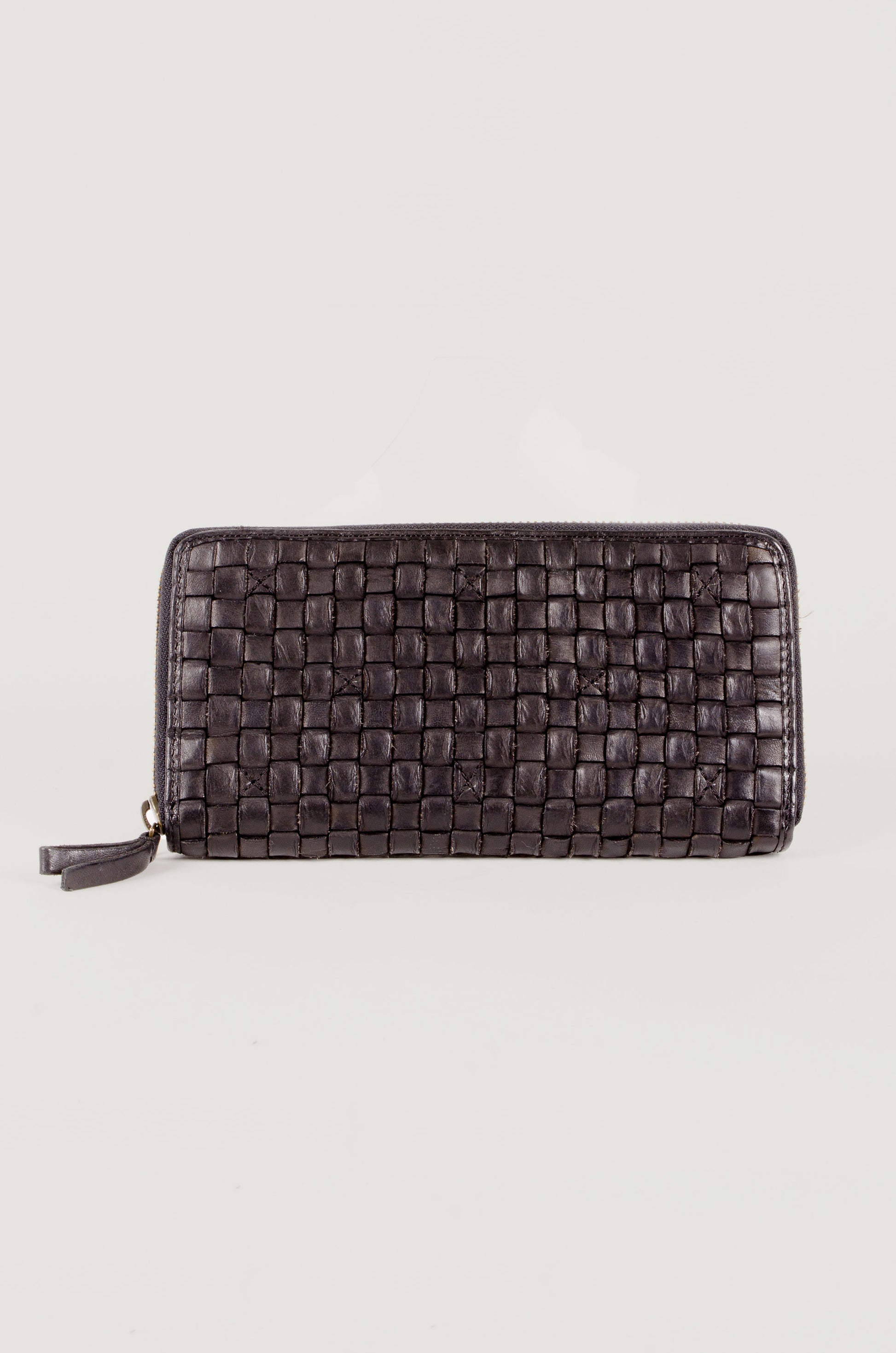 Natural leather that’s been washed, dyed and woven. Will develop a patina over time and soften to become a wallet for life.